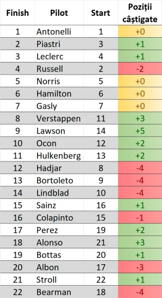 Lui 1️⃣Antonelli i-a fost ușor să păstreze prima poziție, câștigând cursa urmat de 2️⃣Piastri. 3️⃣Leclerc l-a depășit pe 4️⃣Russell, iar mai în spate 5️⃣Norris pe Hamilton, britanicul părând la un moment dat favorit la locul 3, dar terminând pe 6 până la urmă.