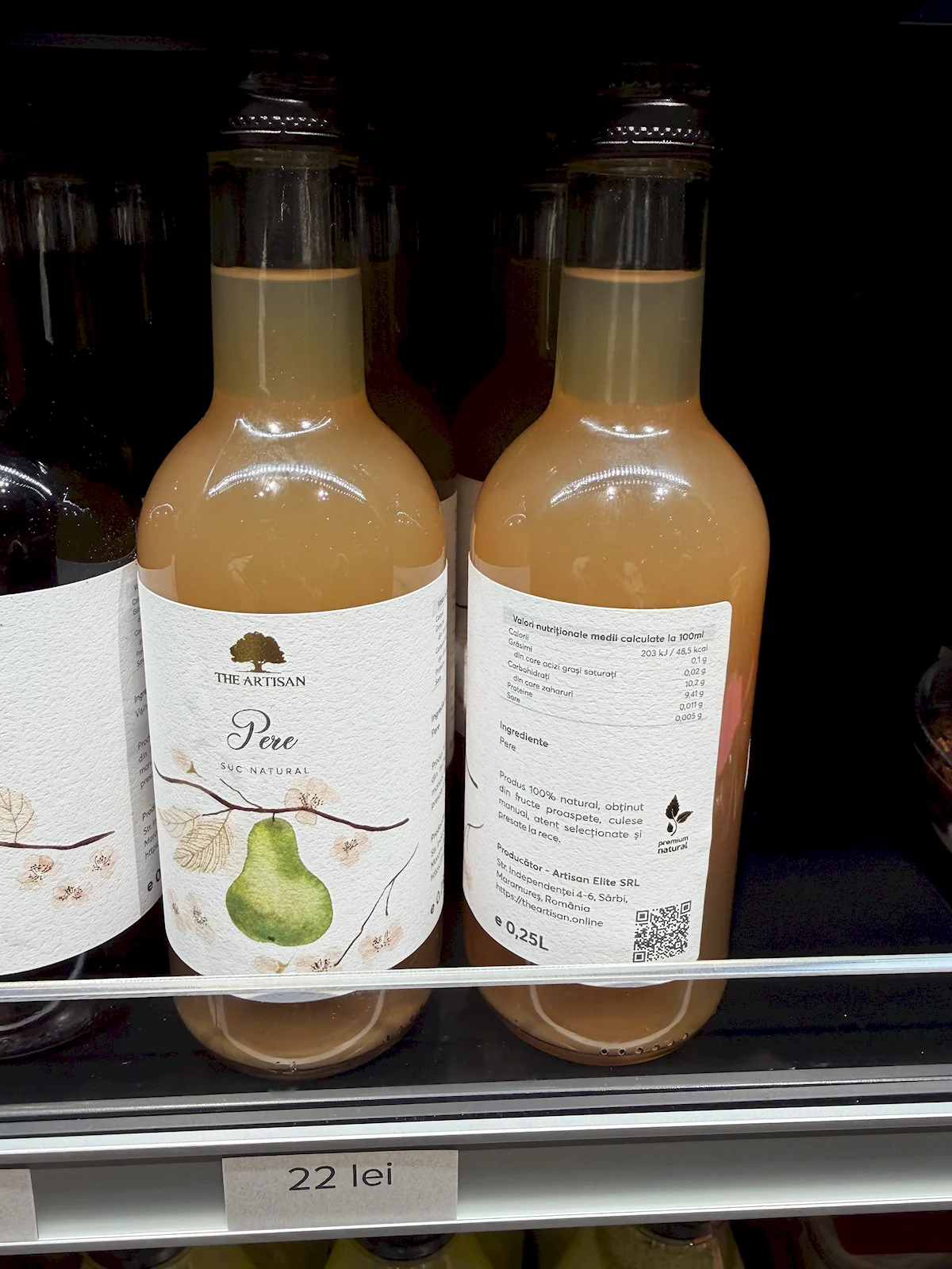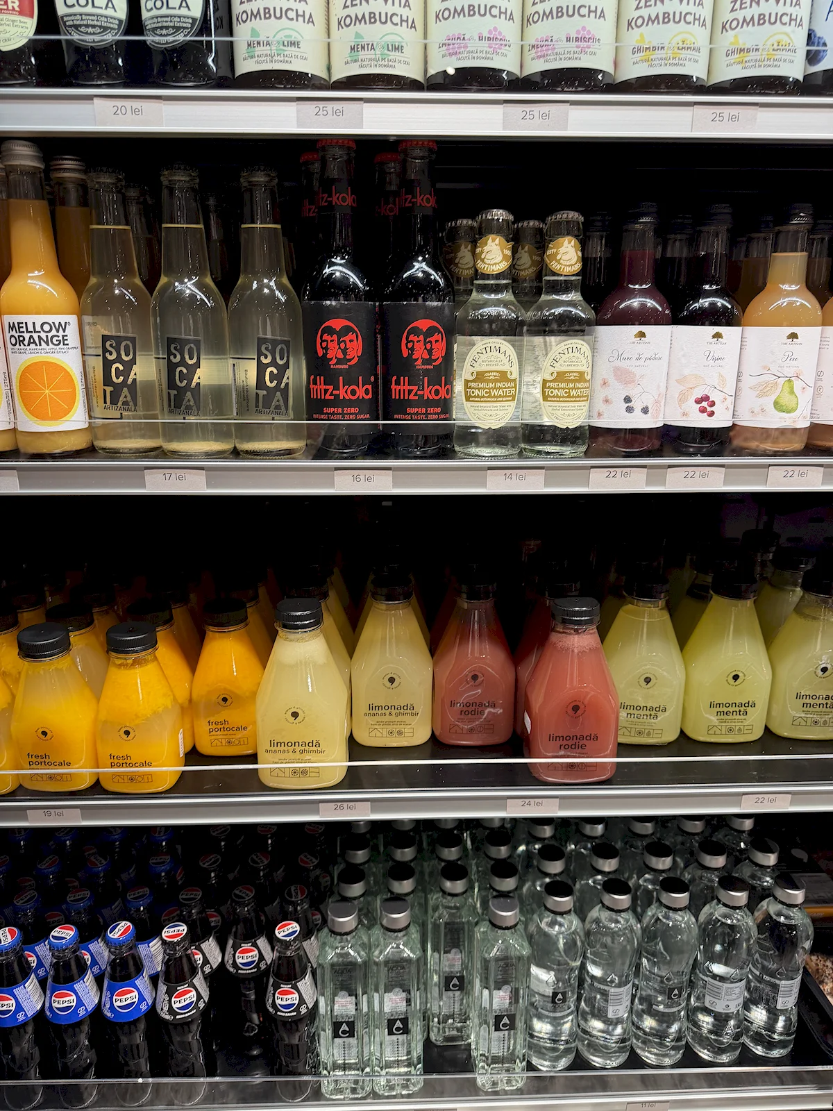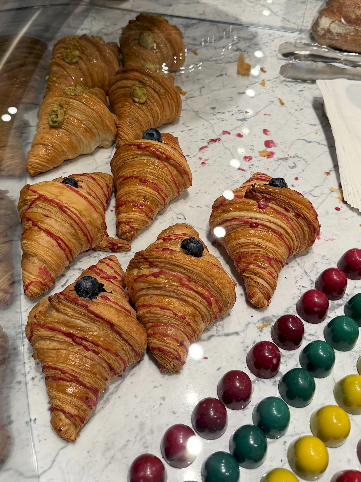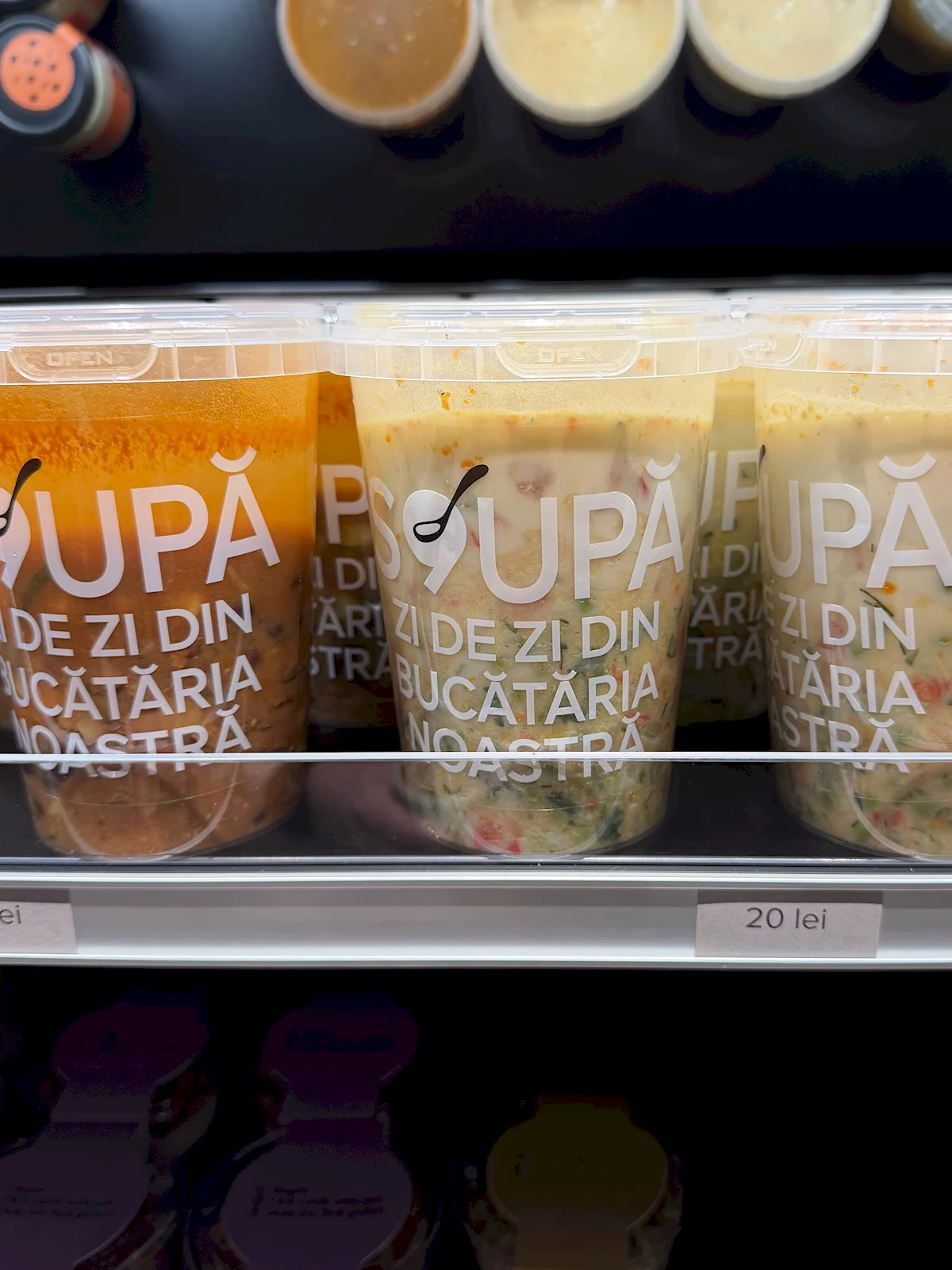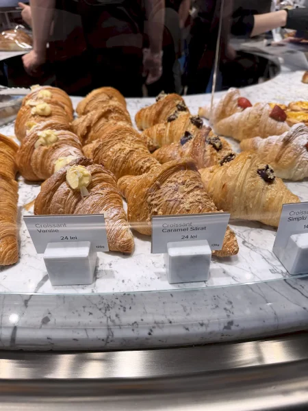 Mai aveau aici croissante cu diverse umpluturi, praline de ciocolată, pâine și, desigur, cafea și sucuri. Frigiderul de sucuri este ascuns undeva în spate, dar au tot felul de sucuri, am văzut inclusiv unul cu branding frumos, 100% natural de fruct, presat la rece, de la un producător din Maramureș. Mai au acolo la frigider și supe și salate, plus alte prăjituri și înghețată, toate făcute de ei.