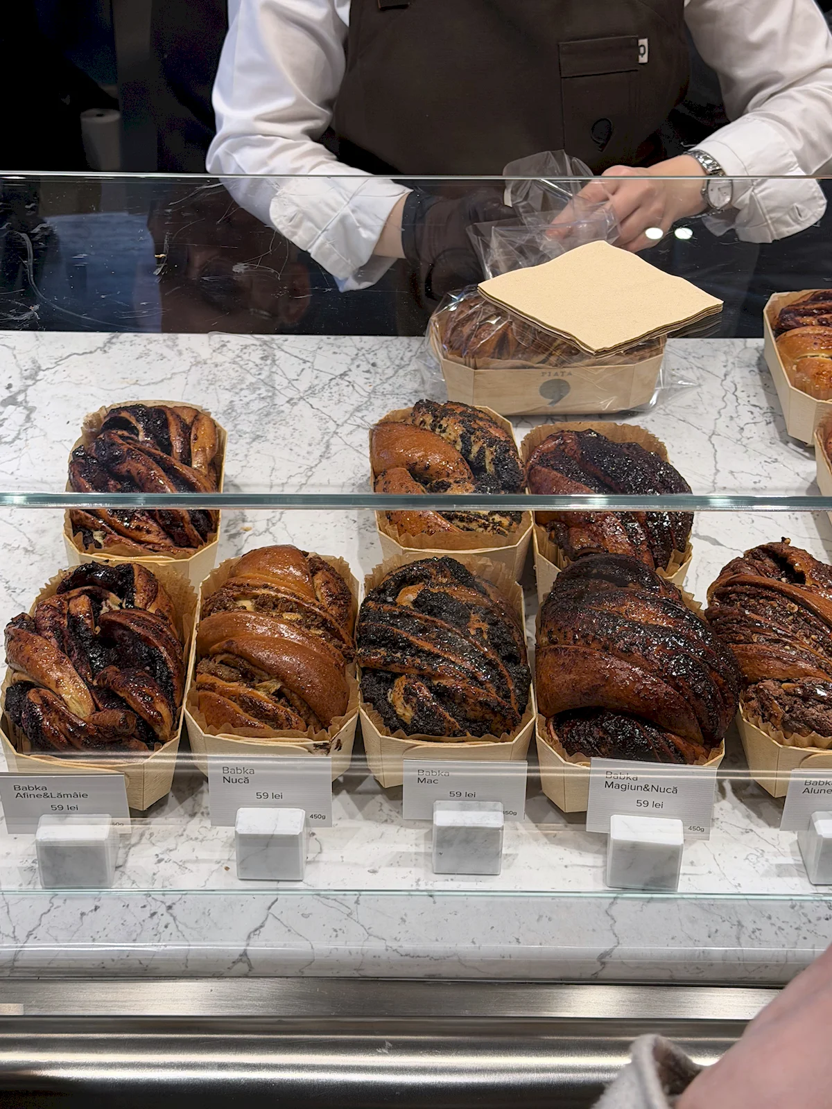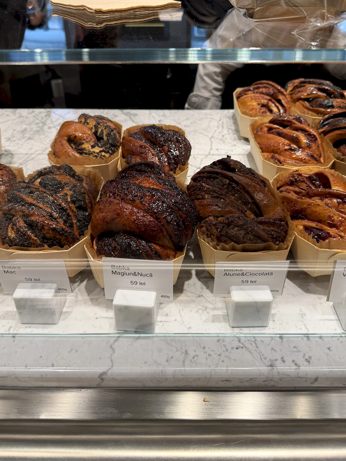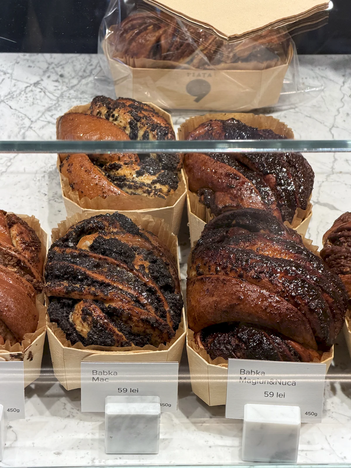 Babka au de 5 feluri, adică au cu mac, cu ciocolată și alune, cu magiun de prune, cu cacao și încă ceva. Știu de la Coffeeast că sunt foarte bune. Am luat pentru acasă. Confirm de acasă că sunt foarte bune. Știu și panettone-ul lor, este de asemenea excelent, mai aerat decât la multe altele.