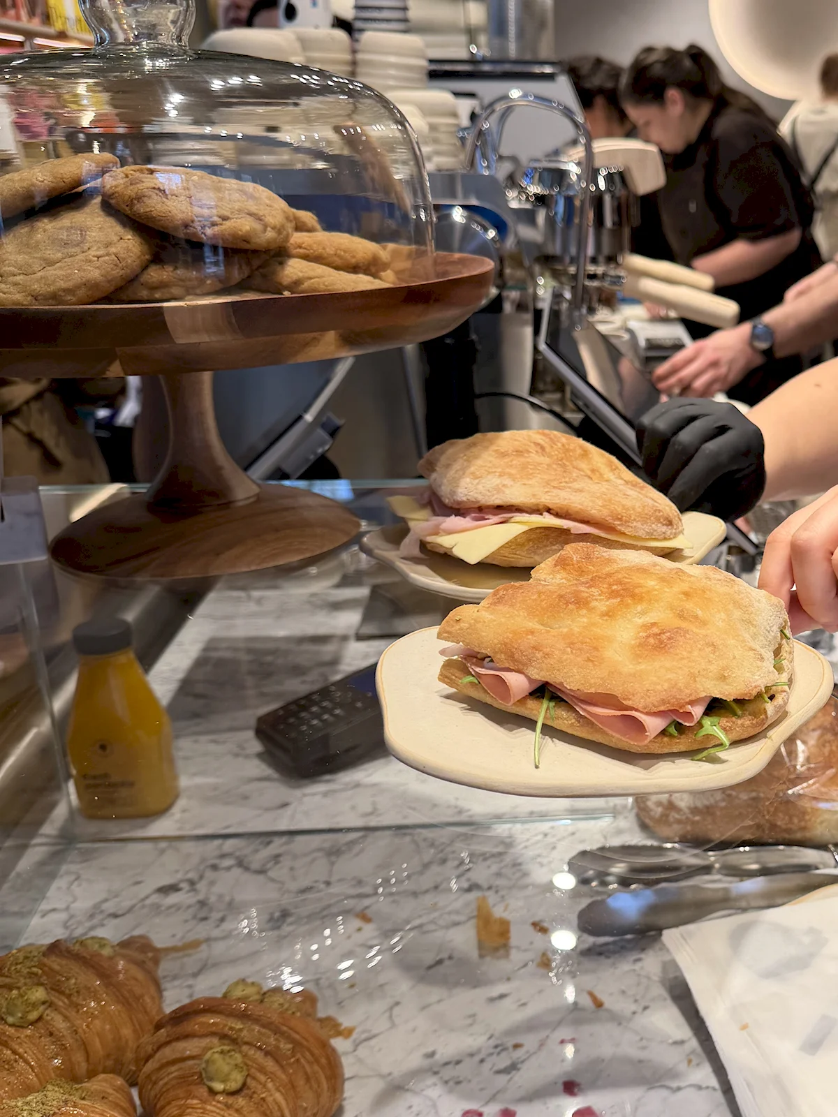 Legat de prețuri, depinde de ce ai ca referință. Flat White la 20 de lei, sandvișul 35 de lei, croissantul 24 lei. Pe de altă parte, la Temple of Brewzeus un cinnamon roll este 30 de lei, la fel și la o micuță cofetărie de cartier de la Brâncoveanu, numită Love at First Bite, care apărea pe Instagram pentru astfel de produse. La Piața9, un cinnamon roll este 19 lei, la fel și un danish, și sunt mult mai bune.