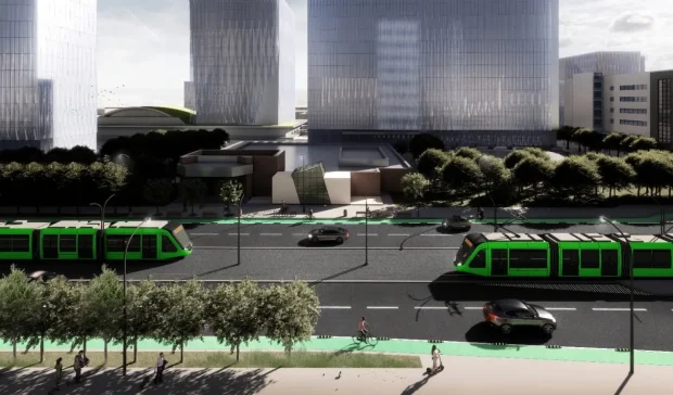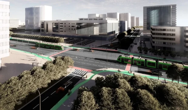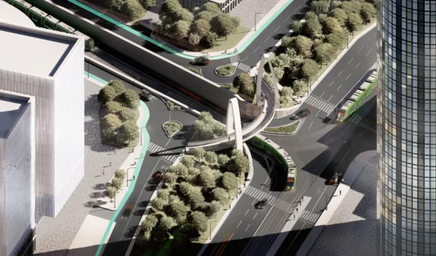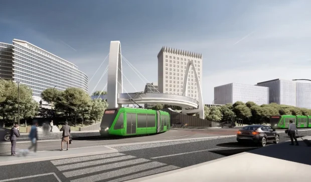 Noua ieșire în Barbu Văcărescu pentru tramvai, cu câte o bandă auto pe lângă șină. Se vede și pasarela pietonală circulară.