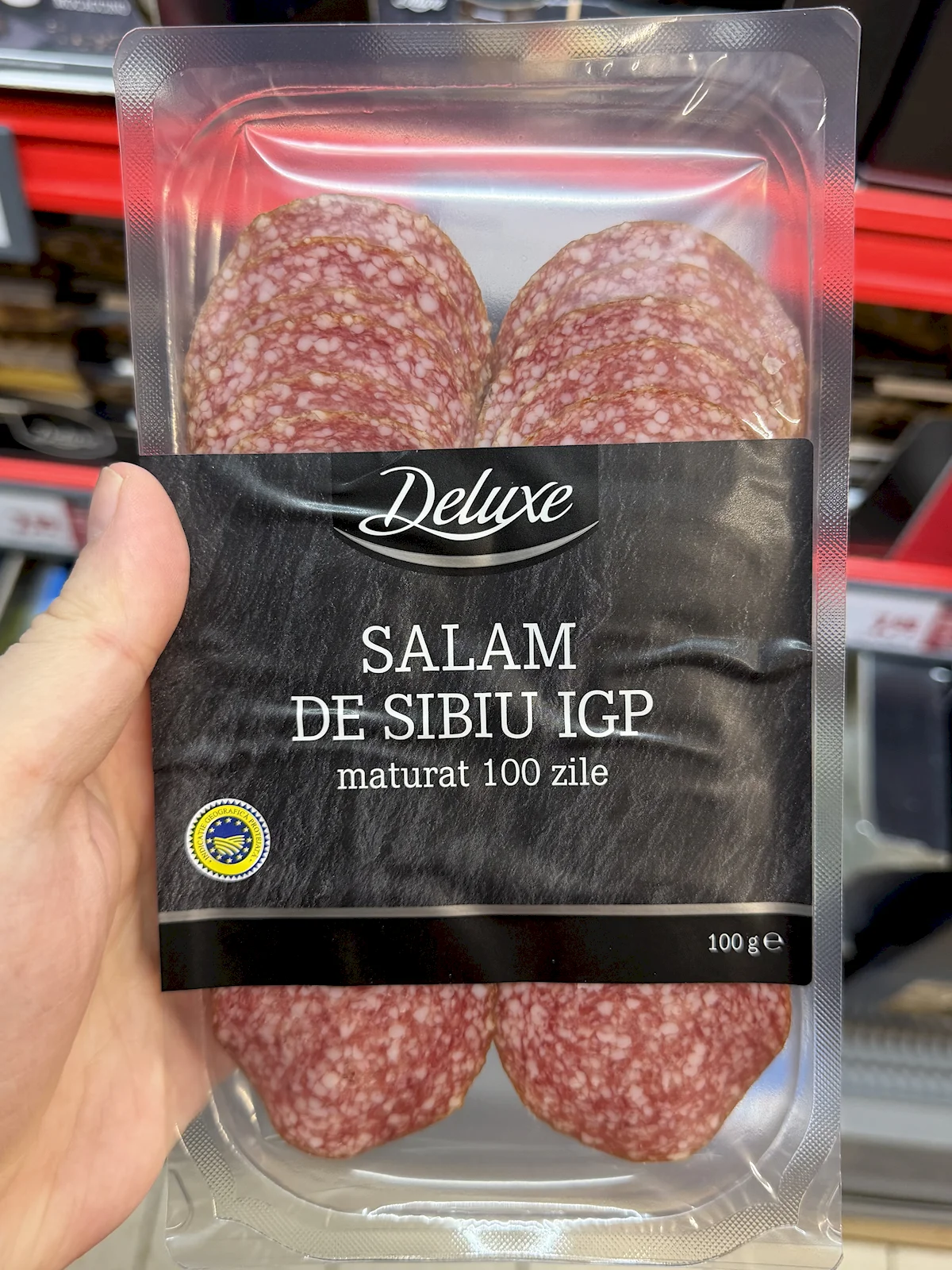 Salamul de Sibiu este foarte bun. Felia este un pic mai grosuță, ca să-i simți gustul pe un sandviș. Am descoperit recent plăcerea unui sandviș cu pâine ușor prăjită, unt, salam de sibiu și fruze de coriandru, eu fiind printre cei genetic cablați să le placă mult coriandrul.