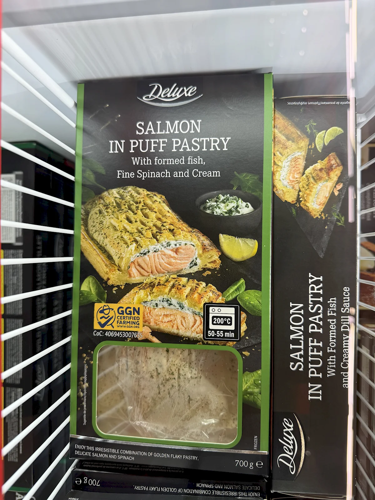 Mai jos vedeți un pachet congelat de file de somon îmbrăcat într-o cremă și foietaj. Este ca un Wellington de somon, ca să zic așa. Am luat de câteva ori, se face bine în cuptor, arată spectaculos când începi să-l tai în felii și hrănește mai multe persoane. Este genul de preparat care poate fi felul principal la o masă mai specială.