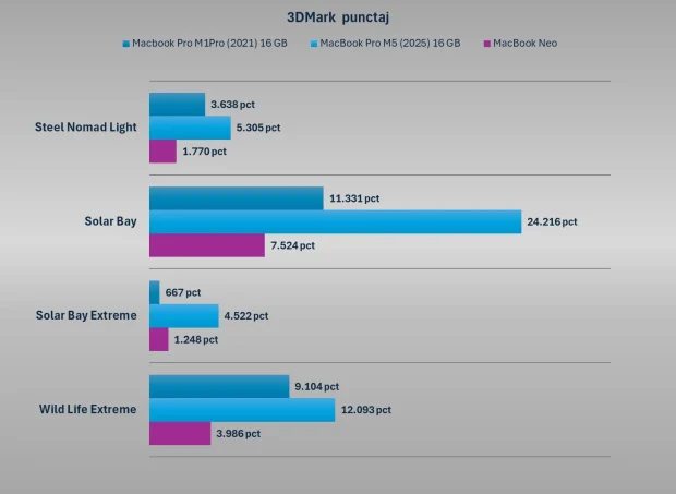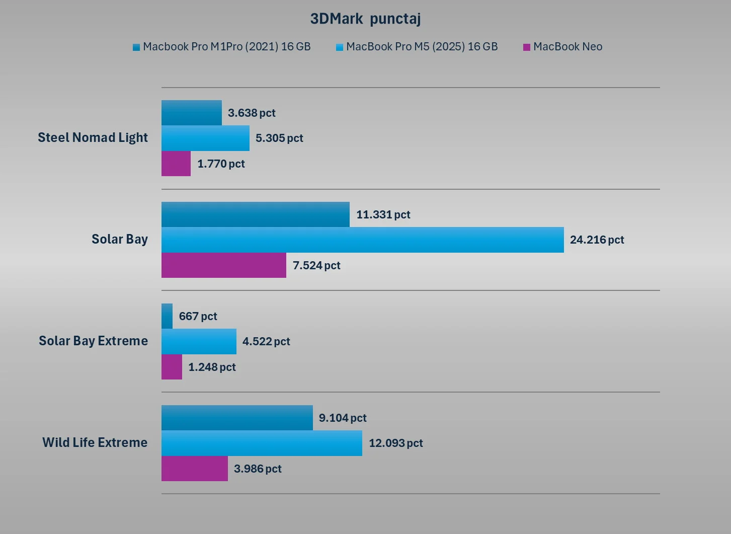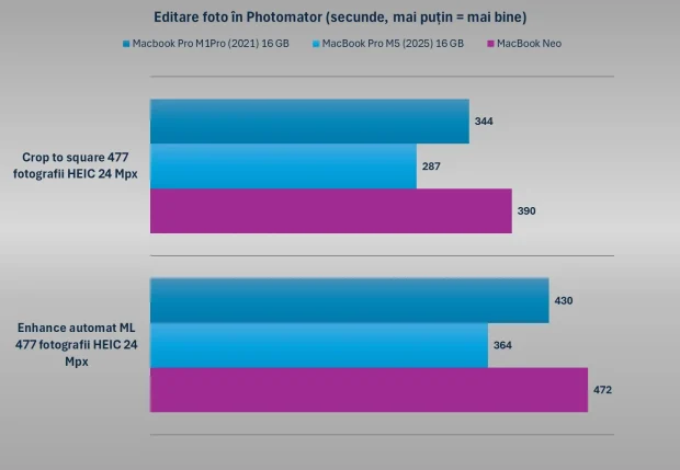 Neo, însă, oricum nu-i gândit pentru jocuri și oricum gamingul pe MacOS este abia la începuturi. Cu aceste teste făcute, dar și din faptul că vreo două săptămâni am lucrat diverse pe MacBook Neo, pot să vă spun că laptopul este neașteptat de bun în aplicații de muncă.