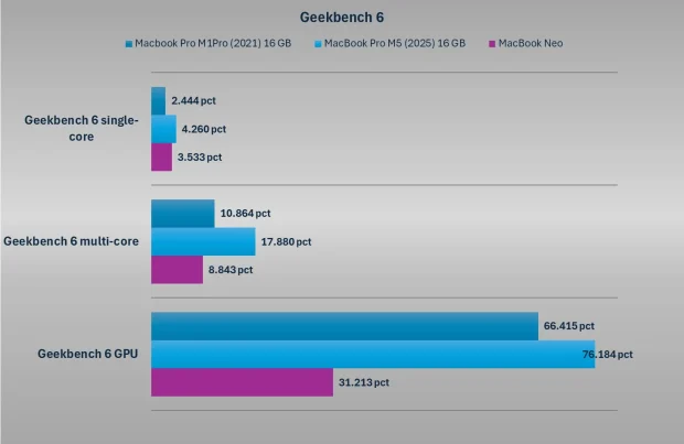 Mai important, însă, este că nu ai de ce să ții un MacBook mereu conectat la alimentare. MacBook-urile sunt la fel de performante pe baterie ca și pe alimentare de la priză. Puteți face orice benchmark în această privință, ca să vă convingeți, așa că puteți încărca un Neo de la priză și apoi să-l deconectați pentru multe ore de autonomie pe baterie.