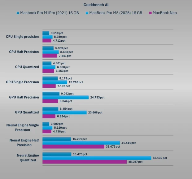 În multi-core apare o limitare adusă de numărul prea mic de nuclee, dar chiar și așa MacBook Neo se descurcă onorabil pentru un chipset de telefon cu 8 GB RAM. De asemenea, în testele AI este mai rapid decât MacBook Pro-ul meu, probabil pentru că are acel Neural Engine mai performant.