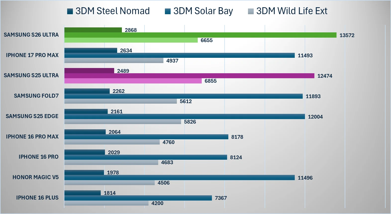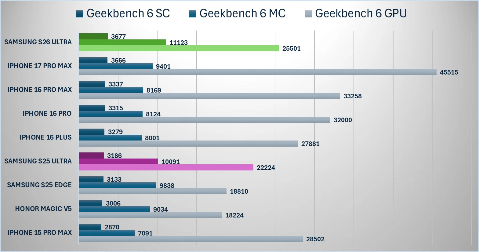 Ca să vorbim mai mult despre hardware, acesta rămâne excelent. S26 Ultra este livrat cu Qualcomm Snapdragon 8 Elite Gen 5 în toate lumea și are 12 GB de RAM, chiar 16 GB pe stocarea de top. Stocarea este rapidă. Performanța chipsetului este de top, benchmarkurile arată valori foarte bune.