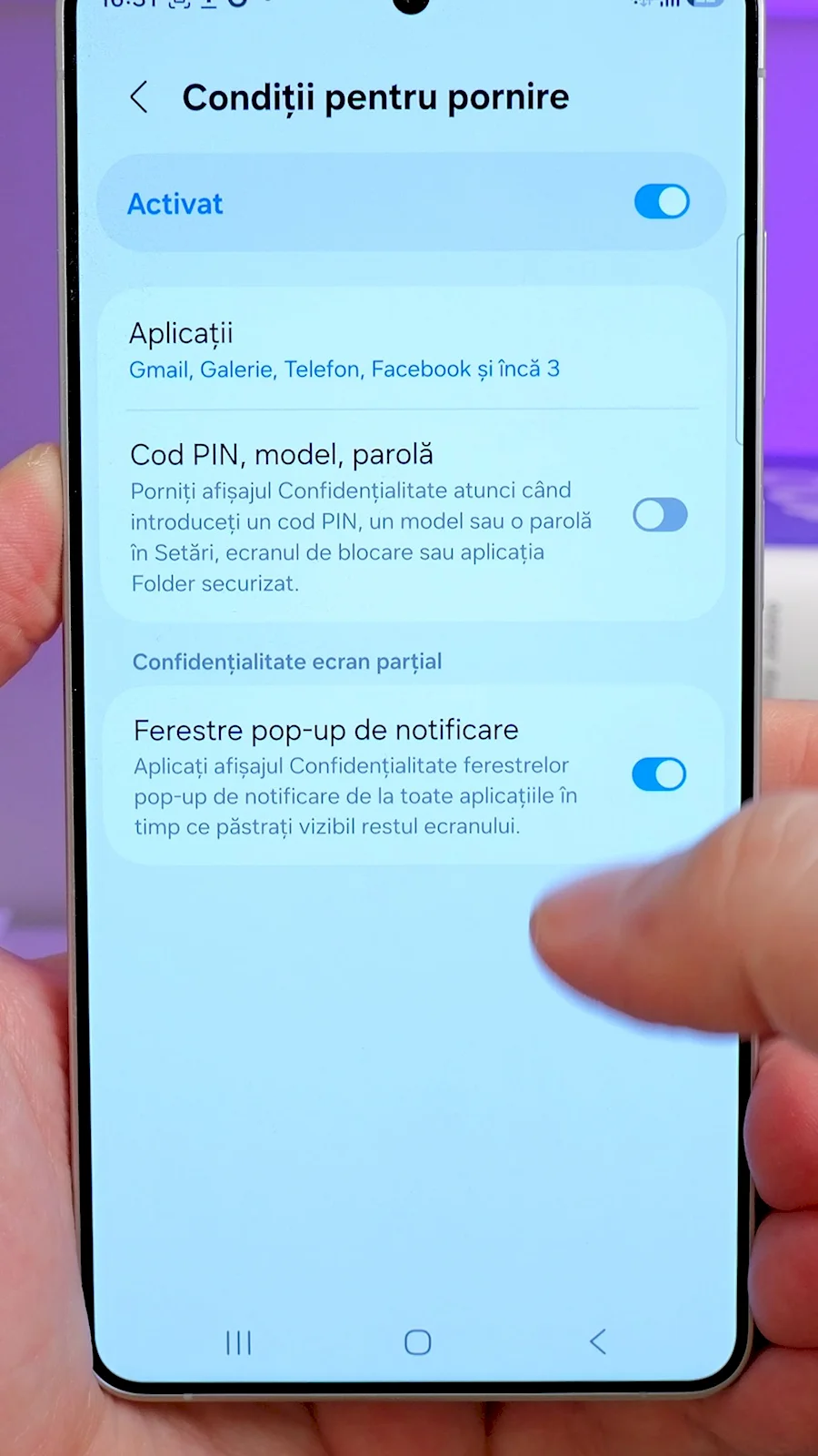 Mai mult, software-ul OneUI oferă posibilitatea de a activa această funcție automat doar când deschizi anumite aplicații sau pentru a înnegri în ochii altora automat notificările care apar în partea de sus a ecranului. Mi se pare bine gândită și părerea mea este că această funcție va fi utilizată de marea majoritate a oamenilor, dacă o au în telefon.