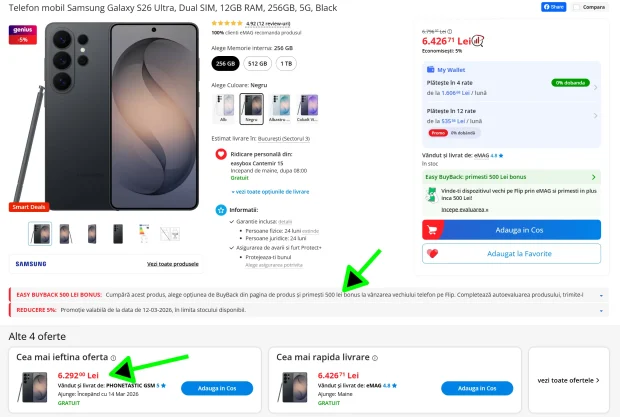 ➡️ S26 Ultra de 256 GB: 6.426 lei vândut de eMAG, plus încă 500 de lei înapoi ca bonus Flip, dacă ai de dat vreun telefon acolo (și, pentru 500 de lei bonus, găsești unul…). Altfel spus, S26 Ultra ajunge la 5.926 lei, un preț cu 1.400 de lei mai mic încă din prima zi oficială de vânzare.