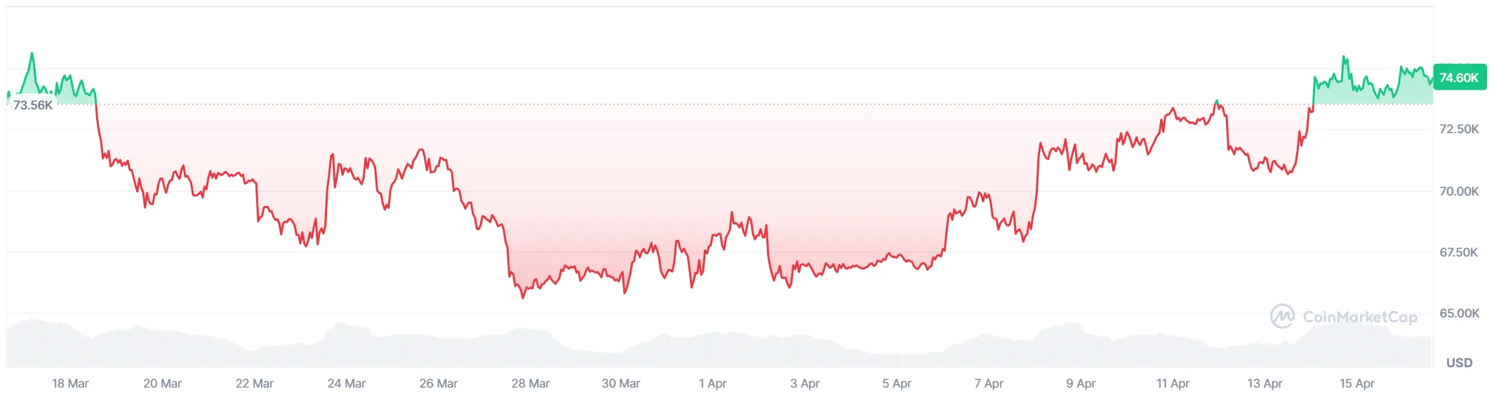 În schimb, Bitcoin a început să crească și a tras și Ethereum și alte criptomonede după el. Creșterea a început pe la 1 aprilie, destul de timidă, valoarea fiind acum pe la 75.000 USD, cu 10.000 de dolari peste cea de la finalul lunii martie.