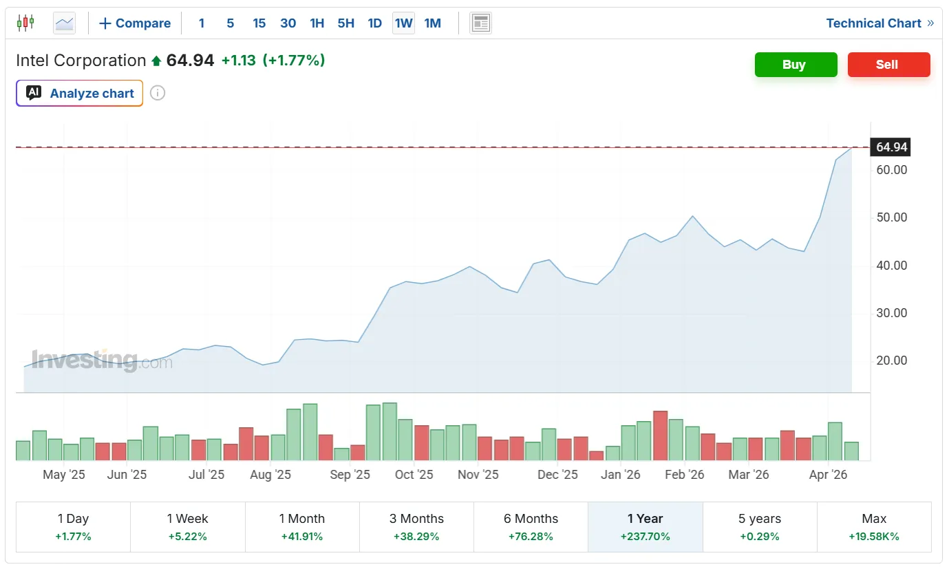 Un alt exemplu de succes este Intel, care a crescut constant în ultimul an. Graficul de mai jos este pe un an și poate vă amintiți ce probleme avea Intel legate de producție, vânzări și performanța procesoarelor, dar au convins investitorii prin parteneriate, eficientizare și planuri bune de viitor. Cine a investit în Intel, atunci la dip, are acum profit mărișor.