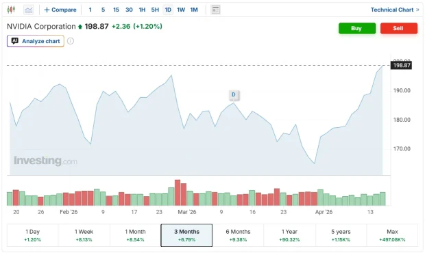 NVIDIA este într-o situație remarcabilă. Acțiunile sunt pe la 198 USD, foarte aproape de recordul de 212 USD de prin noiembrie 2025.