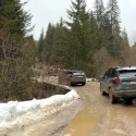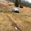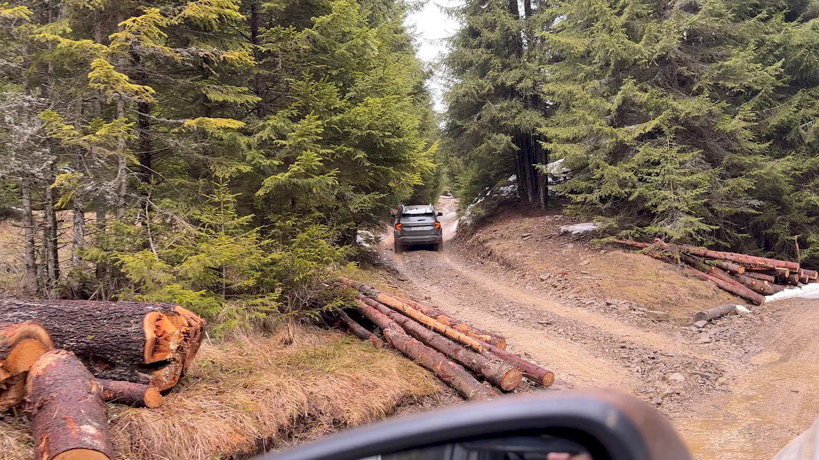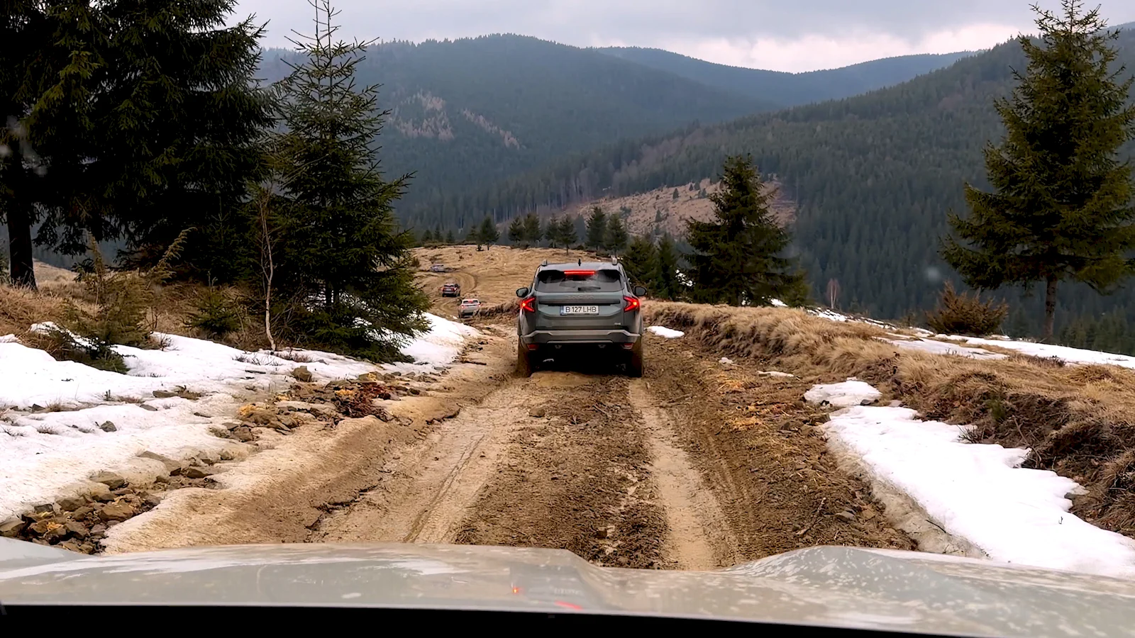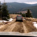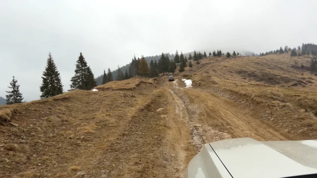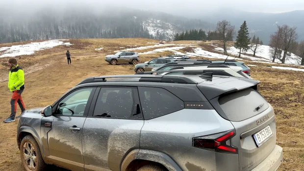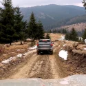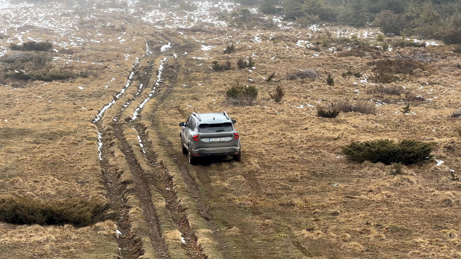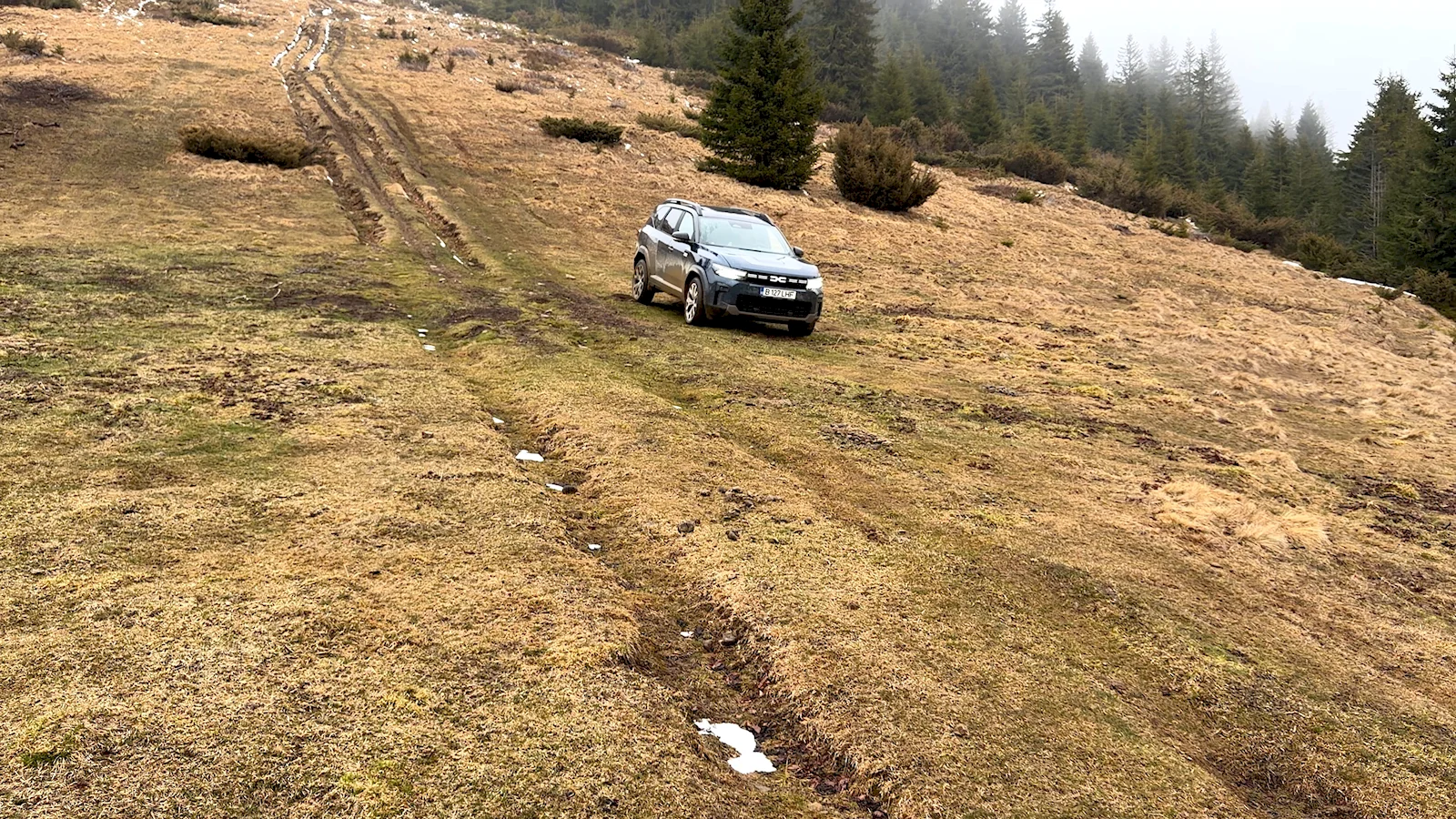 Am intrat apoi pe niște hârtoape pe unde puține mașini ar trece. Noroi gros, șanțuri foarte adânci în care stăteau roțile, denivelări mari pe terenul foarte vălurit. Scuturile mașinii și-au făcut datoria la niște pietre mari cât pumnul. Duster are un unghi de atac de 31 de grade, un unghi de degajare de 36 de grade și un unghi de rampă de 24 de grade, adică valori foarte bune pentru a trece cu succes prin astfel de denivelări și trasee. Am ajuns până aproape de vârf, iar noroiul depus pe mașină arăta cât de bine și-a făcut treaba pentru a ne duce acolo.