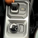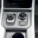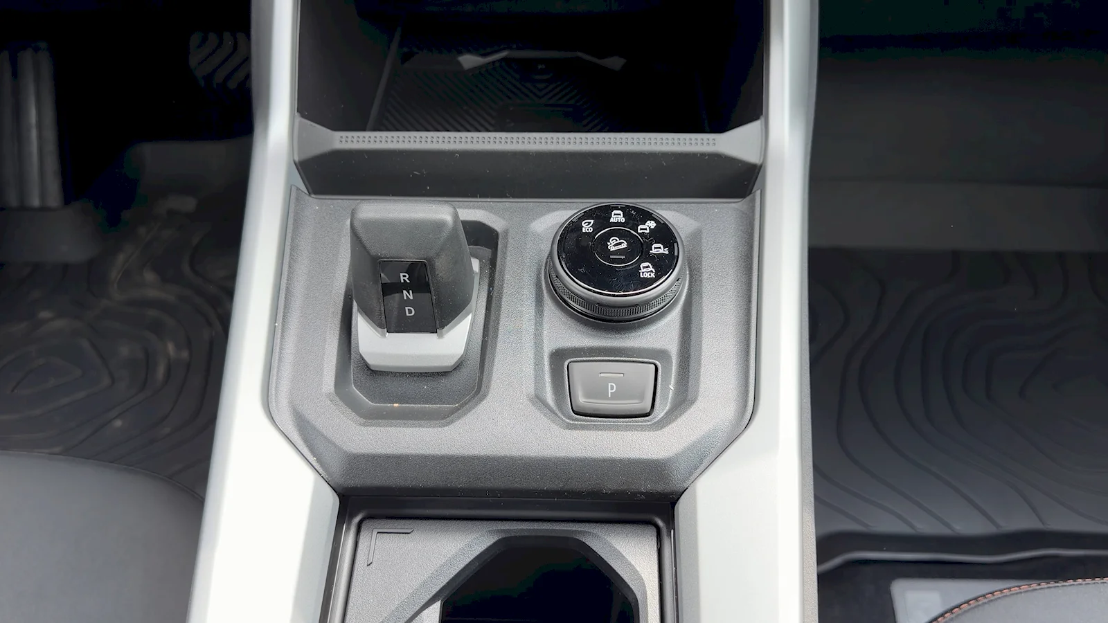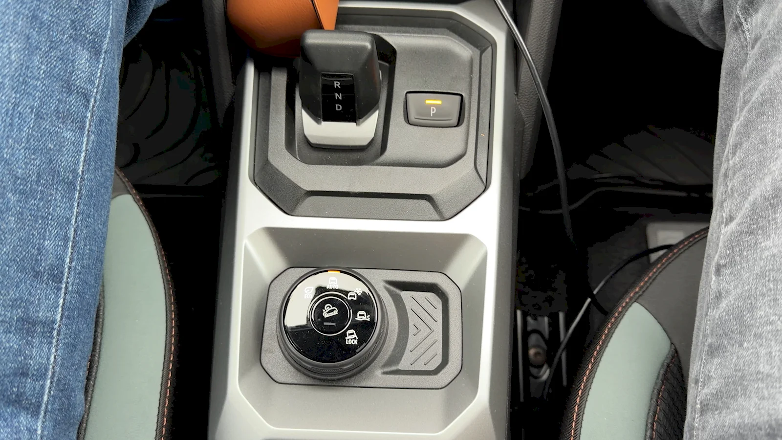 În interior, pe centru, ai acum un schimbător micuț de moduri de condus, specific mașinilor automate, iar lângă acesta ai un comutator rotativ pentru sistemul 4×4. Poți schimba de acolo între modurile Auto, Noroi, Zăpadă, un mod Eco, blocarea diferențialului și inclusiv un mod de asistență la coborârea pantelor.