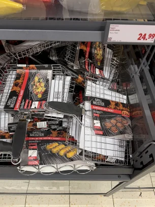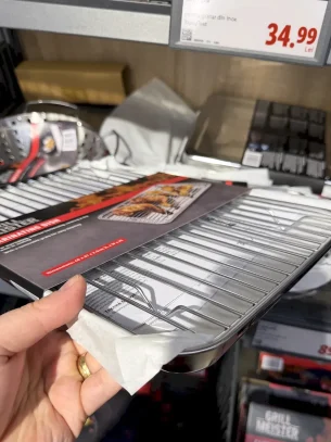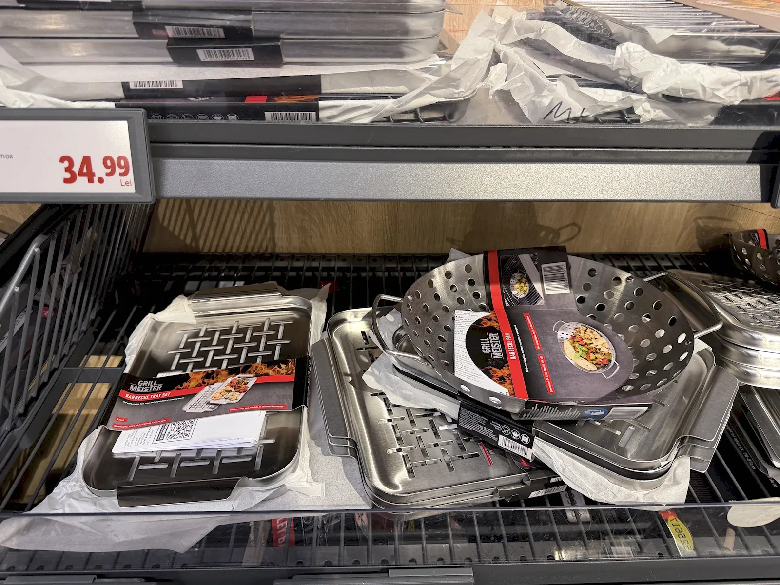 Au în această perioadă, de fapt, o mulțime de produse utile pentru grătar, precum aceste tăvi perforate în care puteți găti diverse legume sau măcar încălzi pe grătar alte preparate gătite anterior. Eu am cumpărat bolul acela cu perforații rotunde și două mânere, care poate fi util în multe moduri la un grătar.
