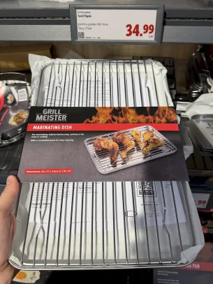 Am mai cumpărat însă o mulțime de alte accesorii pentru preparat mâncarea, inclusiv tava de mai jos, pe care v-o recomand. Am văzut că mai toți youtuberii folosesc o astfel de tavă cu grilaj în ea, în timp ce, la noi, lumea coace mai degrabă pe hârtie de copt pusă în tavă. Eu mai am una acasă, dar am mai cumpărat o a doua din Lidl, că sunt foarte utile.