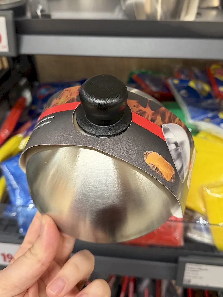 Mi-am mai luat acest capac cu mâner, al cărui scop este să-l pui în tigaie sau la grătar, peste un preparat, ca să păstrezi acolo aerul cald. Unde îl folosesc eu? La un burger, când pun brânza peste chiftea în tigaie/grătar, apoi acopăr cu acest capac și aerul se încălzește și topește brânza. Mai folosesc aceeași metodă la ouă-ochi ca să întăresc albușul din partea superioară, dar ținând gălbenușul moale.