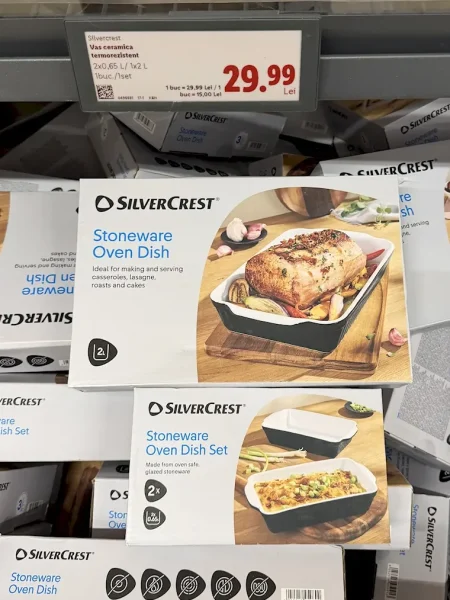 Tot aici aveau vase termorezistente la 30 de lei. Atât costa unul de 2 litri sau un set de două vase de 0,65 litri fiecare. Am luat și noi unul de 2 litri.