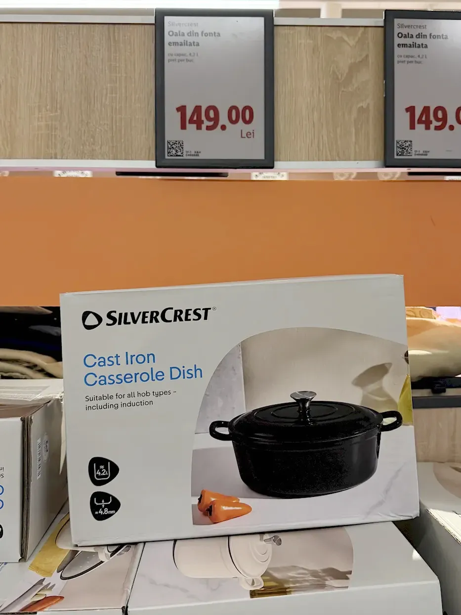 Oala de fontă emailată, cu capac inclus, de 4,2 litri, mi se pare o afacere foarte bună pentru 149 de lei. Eu am una mai mică și pe care cred că am dat mai mulți bani la vremea ei. O folosim la fripturi gătite lent.