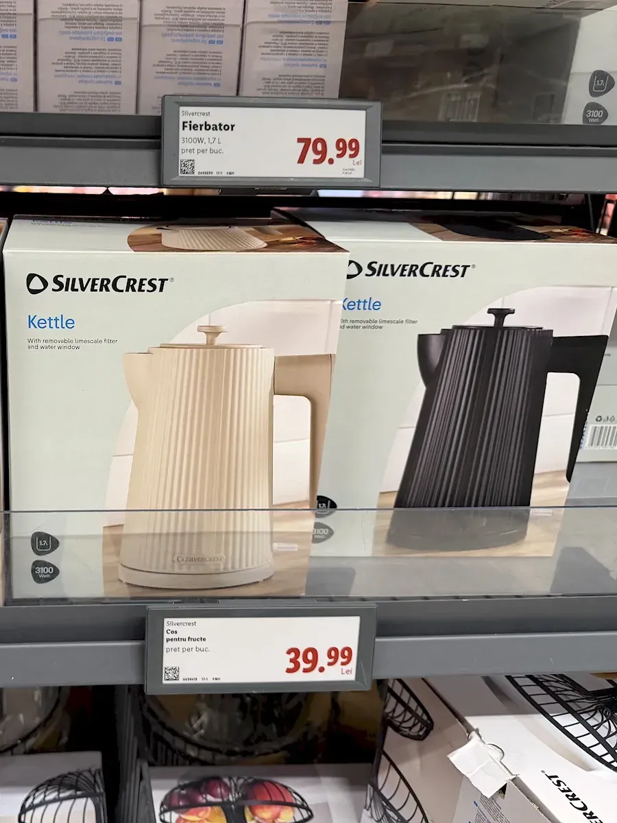 80 de lei un fierbător Silvercrest de 1,7 litri. Era pe gri sau negru, arăta și bine.