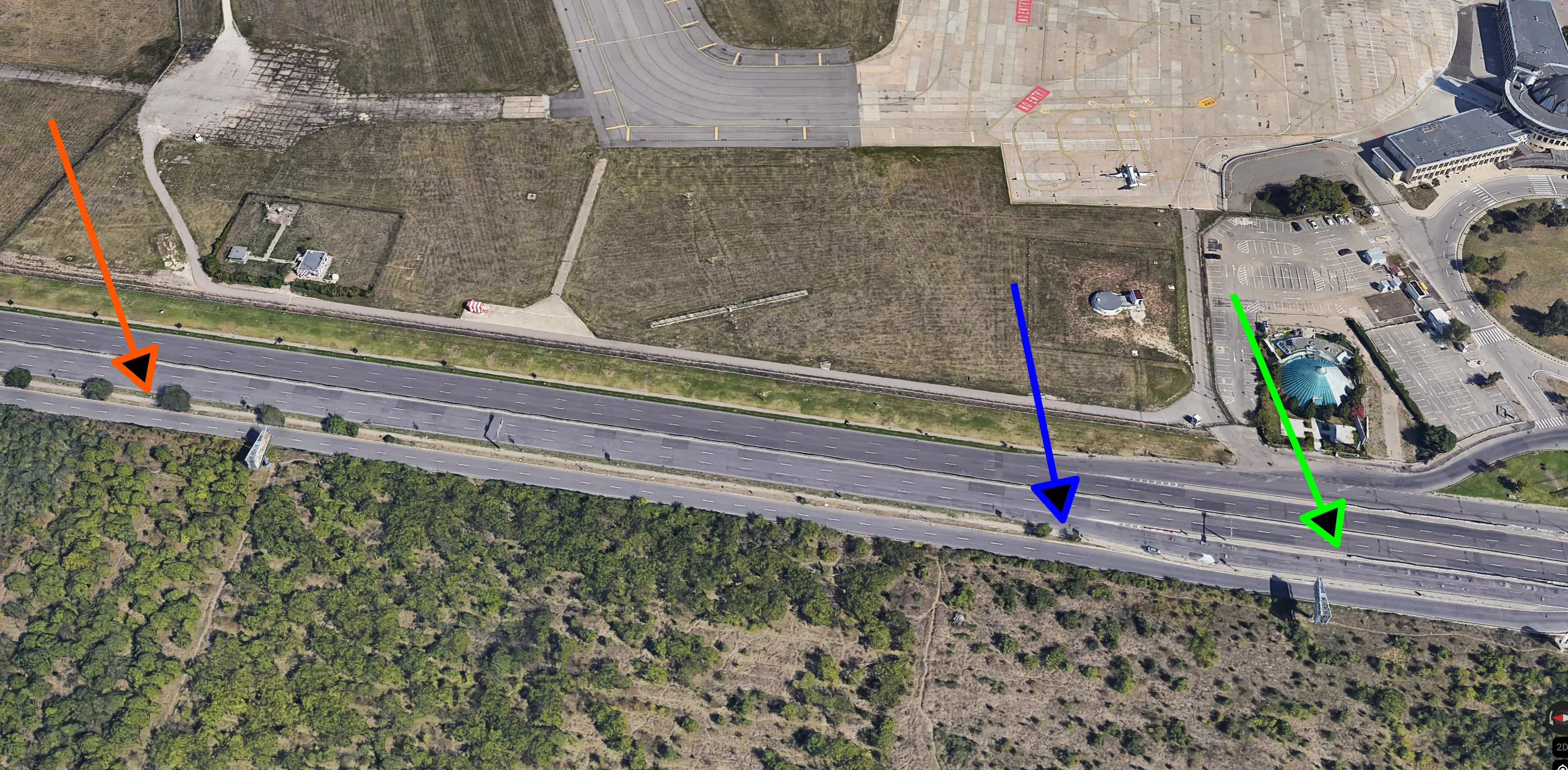 Și acum revenim la ideea mea. Observați situația în imaginea de mai jos. La săgeata verde deja începe pasajul subteran. La săgeata albastră este locul maxim de blocaj, de acolo începe de fapt zona de deasupra.