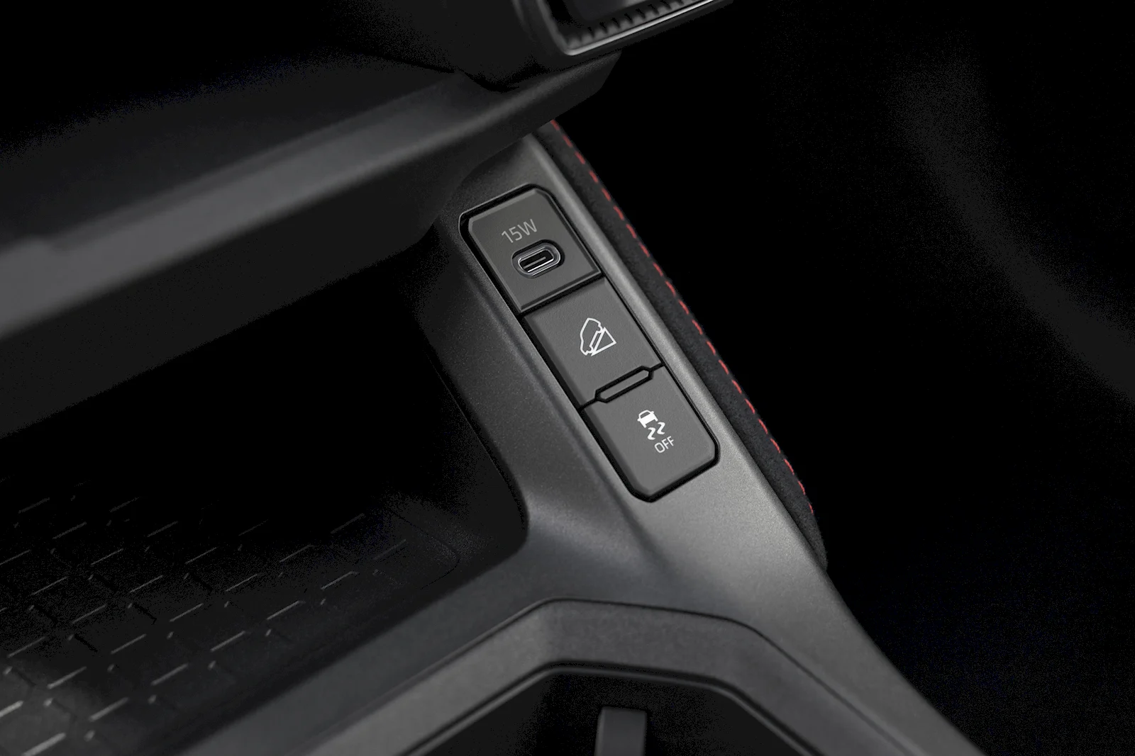 În interior pare că au pus butoane fizice oriunde s-a putut, inclusiv pe marginea micului spațiu de depozitare și a încărcătorului wireless din bord.