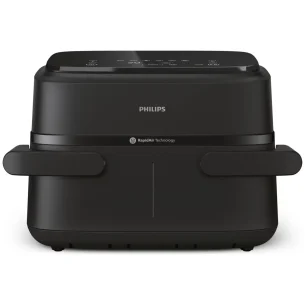 Dacă vreți o friteuză ieftină pentru maxim 2 persoane, Tefal vinde una cu 200 de lei. Dacă vreți o friteuză mai mare, eu aș alege-o pe aceasta Ninja de 6,2 litri, care are un preț foarte bun pentru capacitatea ei. Gătiți acolo fără probleme pentru 3 persoane. O altă variantă bună poate fi aceasta Philips cu două coșuri, de 7 litri, la 500 de lei, sau acest Ninja Foodi DualZone. Este foarte utilă, de fapt, una dual zone pentru că gătești simultan carnea și garnitura ei, pentru întreaga familie.