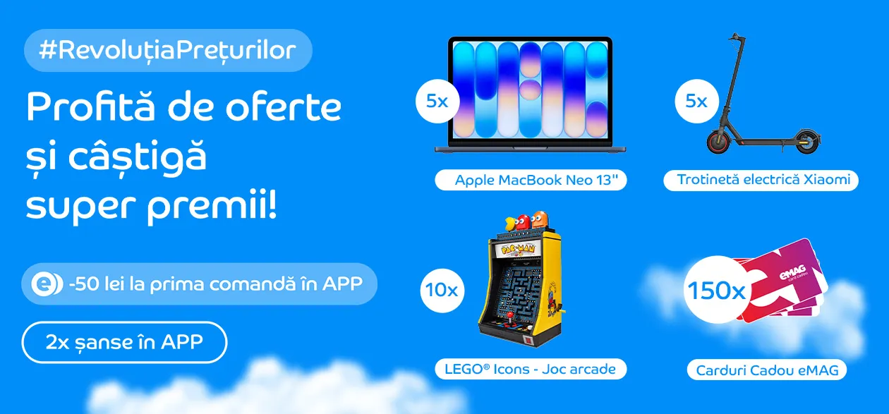 eMAG face acum Revoluția Prețurilor, care cred că este o campanie trimestrială de reduceri de prețuri. Pe lângă prețurile reduse, cei care cumpără un produs din campanie pot câștiga și 5 MacBook Neo, trotinete Xiaomi, jocuri LEGO și 150 de carduri cadou eMAG.
