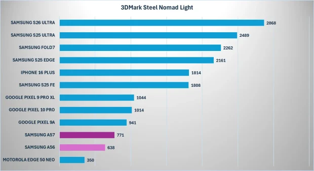 Și modulul grafic a primit un mic upgrade. În Geekbench 6 GPU, testul nu arată vreo diferență, dar în randare 3D ea se vede imediat. În 3DMark, rezultatele sunt cu 20-25% mai bune decât ale generației anterioare.