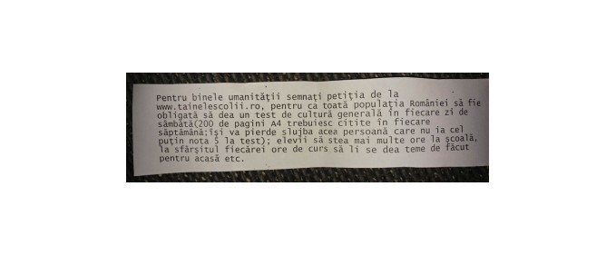 Nashu_mare (pentru mine, chiar e naș) a găsit în cutia poștală următorul bilet: Totul este atât de amuzant încât trebuie să citiți acel site dubios. Meniul site-ului include pagini precum “strategii pentru luarea bacalaureatului”, dar și “strategii ca să nu se ia bacalaureatul”, că poate e dificil să pici examenul și ai nevoie de instrucțiuni. Partea cu petiția respectivă este însă criminală. Citez din prevederile acesteia: 1. Se va promulga o lege prin care dau un test de cultură generală toţi cei care doresc să se angajeze sau să rămână angajaţi. […]